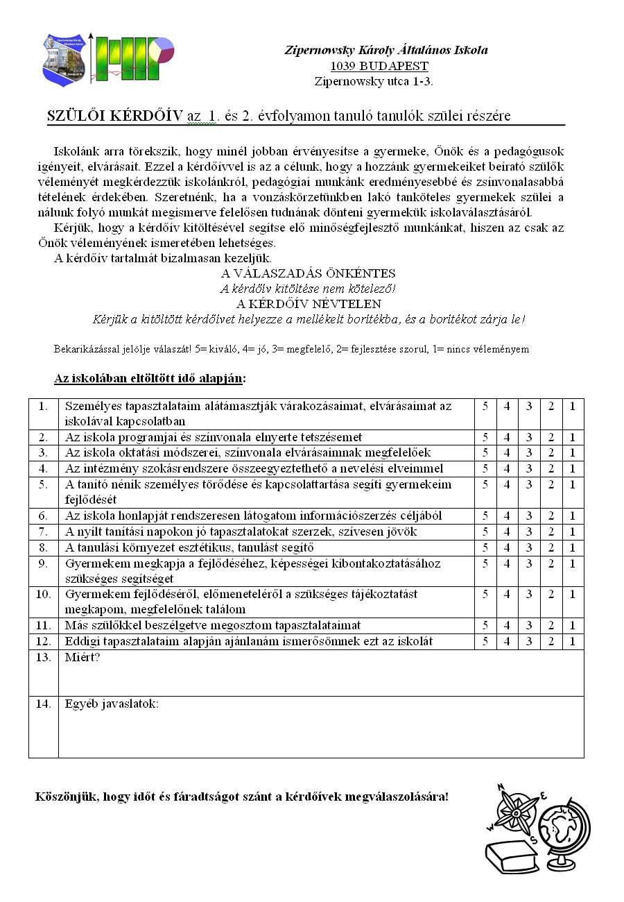 Ennek alapján következtetéseink az alábbiak. Elégedettek az iskolában rendezett programokkal, az oktatási módszerekkel, az itt folyó pedagógiai munka és nevelés színvonalával. Az intézményben folyó nevelés összecseng a szülők nevelési elveivel. Kiemelték a tanító nénik személyre szóló törődését, a szülőkkel való kapcsolattartást és tájékoztatást a tanulók előmeneteléről. Az osztálytermek esztétikusak, felszerelésük új, variálható, a tanulási módszereknek megfelelő, a falakon figyelem felhívó dekorációk segítették a tanulást. Mindezek a szülők számára megtekinthetők a nyílt napok óráin, amelyekre egyébként szívesen, érdeklődéssel jönnek. A szülők egymás között megbeszélik és megosztják tapasztalataikat az iskolánkról. Ismerőseiket személyes beszélgetések során tájékoztatják intézményünkről, az itt folyó munkáról, bátran ajánlják nekik, hogy ebbe az iskolába írassák be gyermekeiket.